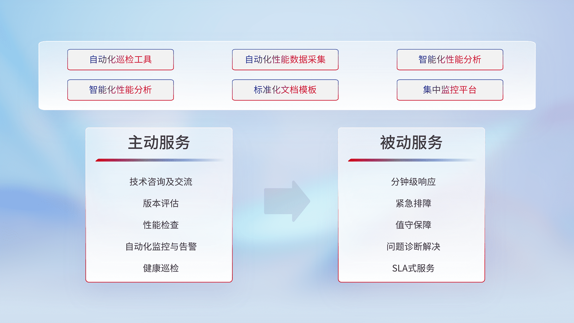智能化工具和标准化文档,,,保障服务质量,,,提供主动服务(包含技术咨询、、、、版本评估、、性能检查、、、、自动化监控与告警、、、健康巡检)和被动服务包含(分钟级响应、、、紧急排障、、、、值守保障、、、问题诊断解决、、、SLA服务)。。。。