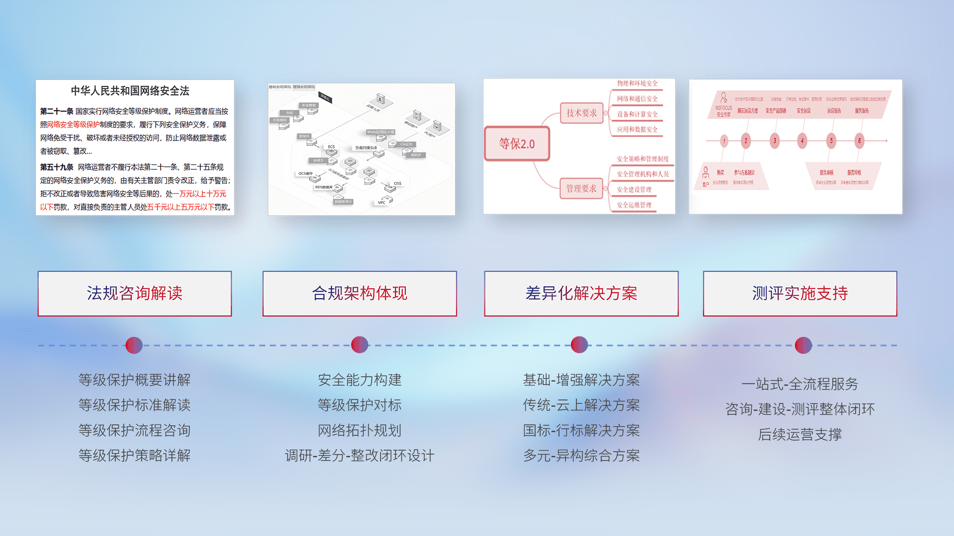 通过专业的法律咨询解读、、、合规架构体现、、、差异化解决方案、、、、测试实施支持等服务,,,,为客户量身打造等保合规体系。。